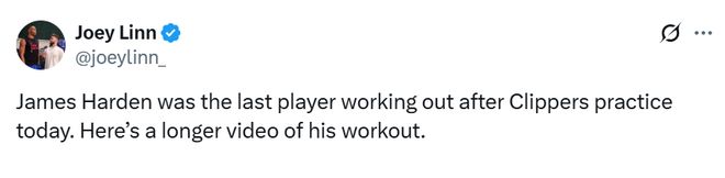 快船多位队记表示,36岁的哈登是今天练到最后一个离开的球员。他加练了大量的三分球和中投,此前,哈登曾表示目前的身体状态是生涯最佳的水准。