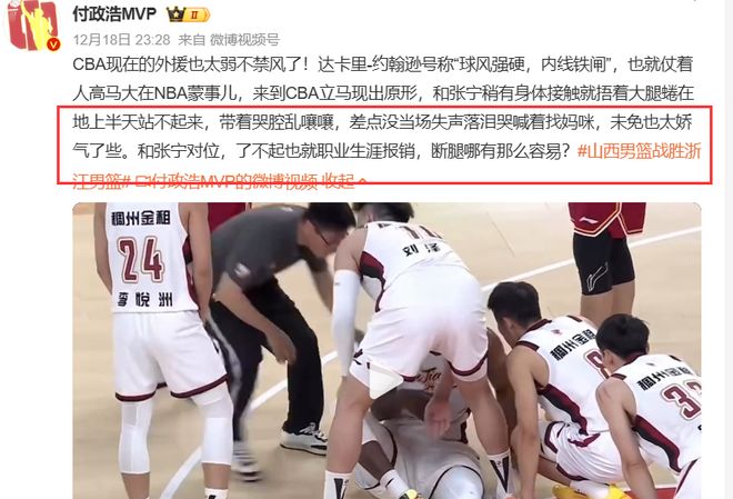 素来对于张宁一些犯规动作颇有研究心得的付政浩在赛后发文,这次付老师一改常态,先是认为CBA现在的外援也太弱不禁风了,达卡里·约翰逊号称球风强硬,内线铁闸,但也就仗着人高马大在NBA蒙事儿,来到CBA立马现出原形,和张宁稍有身体接触就捂着大腿蜷在地上半天站不起来,带着哭腔乱嚷嚷,差点没当场失声落泪哭喊着找妈咪,未免也太娇气了些。