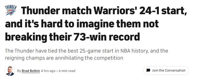 北京时间12月11日,雷霆在NBA杯赛上以49分优势狂胜太阳,24胜1负的战绩追平了NBA历史最佳的25场开局战绩,卫冕冠军正以摧枯拉朽之势横扫联盟诸强。CBS名记Botkin从数据角度解读了雷霆的强大,并相信本赛季的雷霆注定会打破勇士73胜的常规赛纪录,以下是他的文章内容——