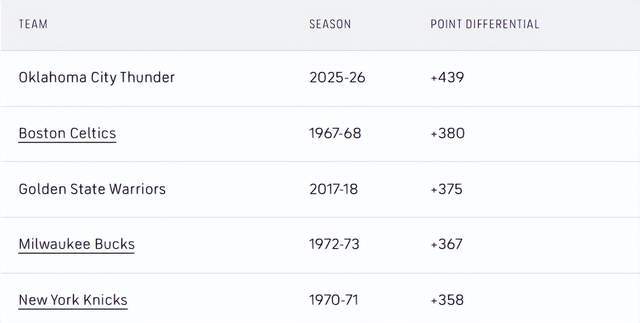 说到疯狂的数据,雷霆本赛季至今的总净胜分已高达439分,以近乎悬殊的优势刷新了NBA历史前25场比赛的净胜分纪录(原纪录是1967-68赛季凯尔特人的380分)。上赛季,雷霆每百回合净胜分12.9分,已是历史最佳;而本赛季25场战罢,他们将这一纪录大幅提升至恐怖的+17.5分。